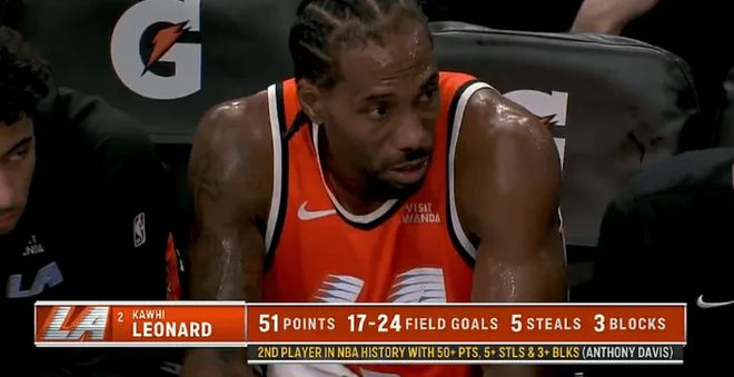 值得一提的是,倫納德已經(jīng)連續(xù)罰中61球,創(chuàng)快船隊(duì)史最高紀(jì)錄;此外單節(jié)轟下26分,三節(jié)打完已經(jīng)轟下51分,創(chuàng)下快船生涯以及職業(yè)生涯新高;還成為NBA歷史第二位砍下50分5斷3帽的球員,一戰(zhàn)連創(chuàng)3大NBA神跡。