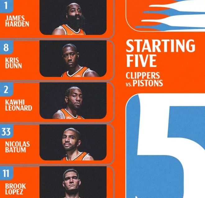 首發(fā)陣容方面,快船隊(duì)這邊,祖巴茨繼續(xù)缺戰(zhàn),保羅也未隨隊(duì),科林斯因?yàn)樯∪标嚕…偹褂瓉韽?fù)出,但有出場時(shí)間限制,泰倫盧排出的最新首發(fā)五人組為:詹姆斯-哈登、克里斯-鄧恩、科懷-倫納德、尼古拉斯-巴圖姆、布魯克-洛佩斯;活塞隊(duì)這邊,首發(fā)陣容則為:坎寧安、鄧羅、奧薩爾、哈里斯、杜倫。