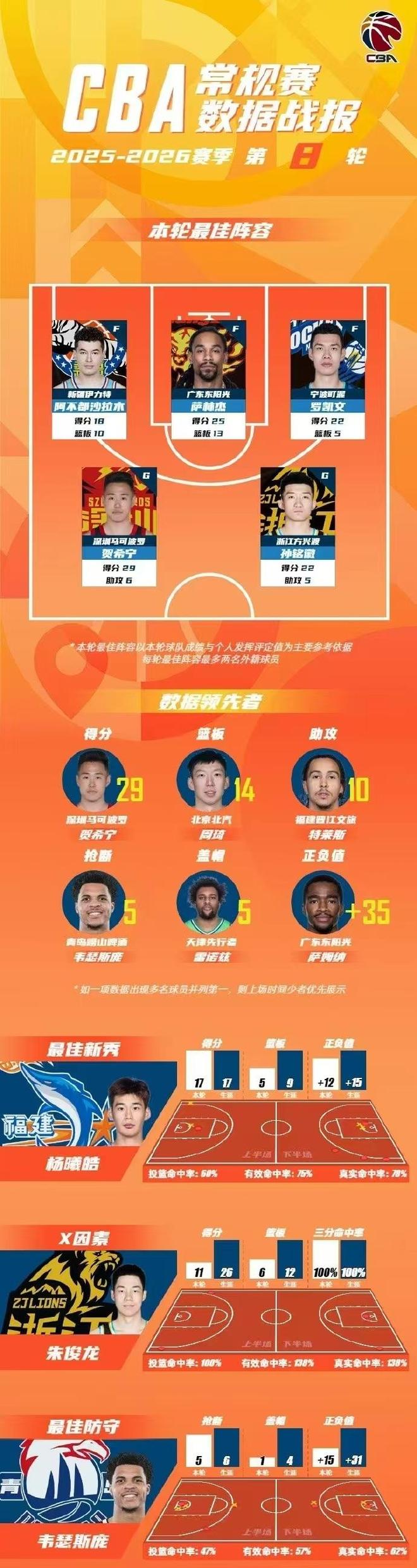 CBA官宣常規(guī)賽第8輪最佳陣容,新疆隊長阿不都8中7高效18+10+7率領新疆大勝結束4連敗領銜,薩林杰25+13率領廣東開局8連勝唯一不敗領跑,賀希寧29+6+6送遼寧3連敗,羅凱文與孫銘徽均是22+5入選,孫銘徽率領廣廈送北京首敗。