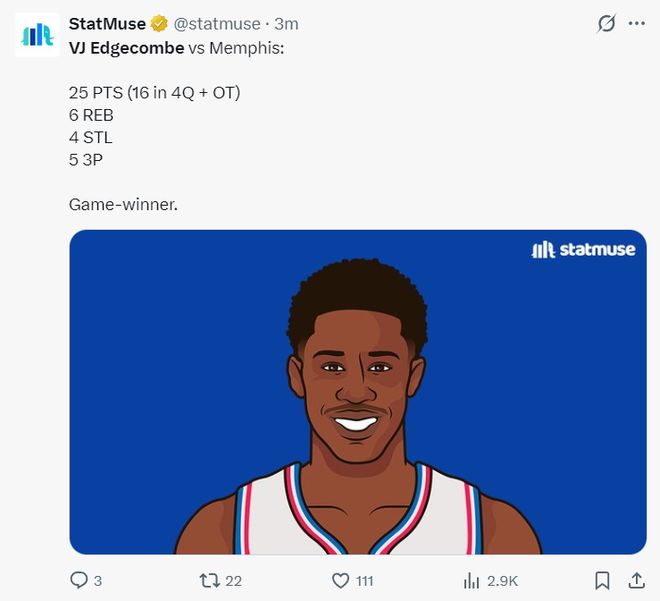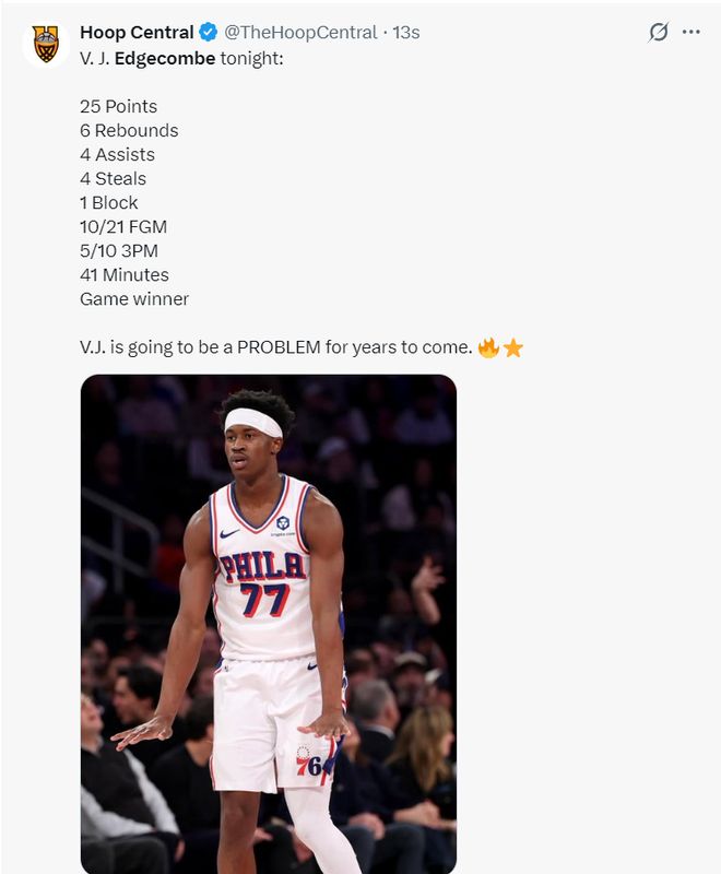 此役埃奇庫姆全場比賽,40分鐘,21中10,三分10中5,拿到25分6籃板4助攻4搶斷1蓋帽,命中率47.6%,三分命中率50%,他的得分僅次于馬克西34分、恩比德34分,喬治此役只有17分。