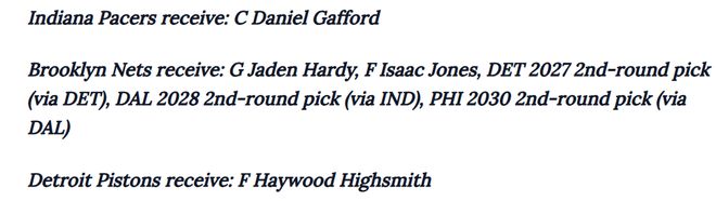 達(dá)拉斯獨行俠:本內(nèi)迪克特·馬圖林、中鋒戴羅恩·夏普印第安納步行者:丹尼爾·加福德布魯克林籃網(wǎng):賈登·哈迪、艾薩克·瓊斯、2027年次輪選秀權(quán)(通過活塞獲得)、2028年次輪選秀權(quán)(通過步行者獲得)、2030年次輪選秀權(quán)(通過費城76人獲得,源自獨行俠)底特律活塞:海伍德·海史密斯