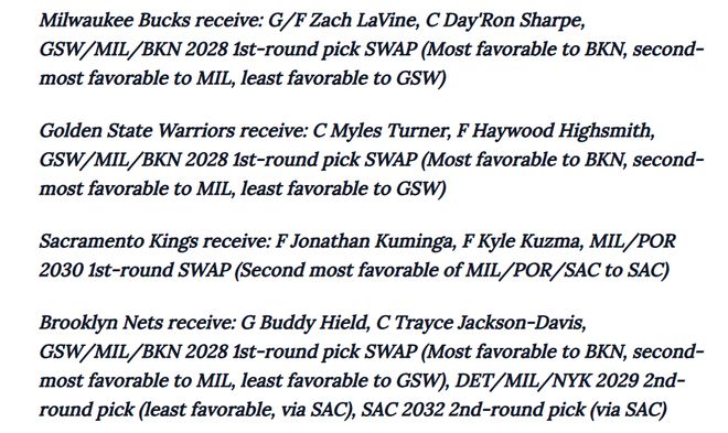 密爾沃基雄鹿得到:扎克·拉文、戴羅恩·夏普、2028年首輪選秀權(quán)互換權(quán)(涉及勇士/雄鹿/籃網(wǎng)三隊,籃網(wǎng)優(yōu)先級最高,雄鹿次之,勇士最低)金州勇士得到:邁爾斯·特納、海伍德·海史密斯、2028年首輪選秀權(quán)互換權(quán)(涉及勇士/雄鹿/籃網(wǎng)三隊,籃網(wǎng)優(yōu)先級最高,雄鹿次之,勇士最低)薩克拉門托國王得到:庫明加、凱爾·庫茲馬、2030年首輪選秀權(quán)互換權(quán)(涉及奇才/國王/馬刺三隊,國王優(yōu)先級僅次于馬刺)布魯克林籃網(wǎng):巴迪·希爾德、特雷斯·杰克遜-戴維斯、2028年首輪選秀權(quán)互換權(quán)(涉及勇士/雄鹿/籃網(wǎng)三隊,籃網(wǎng)優(yōu)先級最高,雄鹿次之,勇士最低)、來自國王的兩個次輪選秀權(quán)