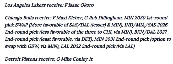 明尼蘇達(dá)森林狼:科比·懷特、道爾頓·克內(nèi)希特洛杉磯湖人:艾薩克·奧科羅芝加哥公牛:馬克西·克萊伯、迪林厄姆、2030年首輪選秀權(quán)互換權(quán)(涉及馬刺/獨行俠/森林狼三隊,森林狼優(yōu)先級最高)、2026年次輪選秀權(quán)(涉及步行者/熱火/馬刺三隊,公牛優(yōu)先級最低,通過森林狼獲得)、2027年次輪選秀權(quán)(涉及籃網(wǎng)/獨行俠/活塞三隊,公牛優(yōu)先級最低,通過活塞獲得)、2031年次輪選秀權(quán)(通過森林狼與勇士的選秀權(quán)互換獲得)、2032年次輪選秀權(quán)(通過湖人獲得)底特律活塞:邁克·康利二世
