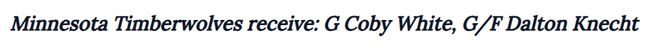 若森林狼隊不愿交易唐特·迪文琴佐或納茲·里德,作為一支志在沖擊總冠軍的球隊,他們唯一能用來交易懷特的籌碼,便是犧牲邁克·康利以及2024年NBA選秀中通過交易得到的第八順位新秀羅布·迪林厄姆。