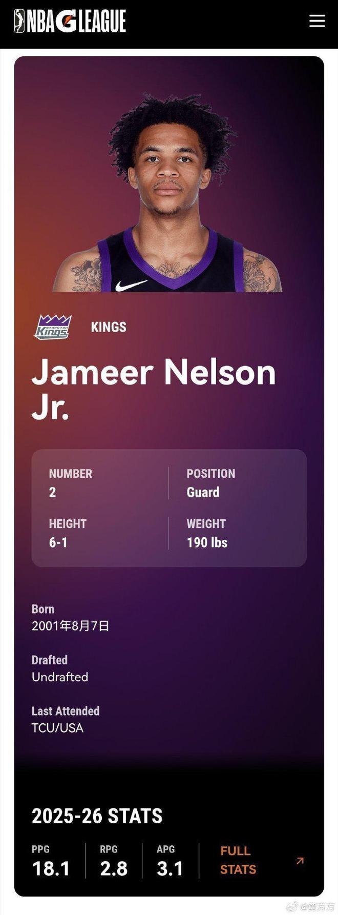 小賈馬爾-尼爾森此前效力于國王下屬發(fā)展聯(lián)盟球隊,他在發(fā)展聯(lián)盟場均得到18.1分3.1助攻。