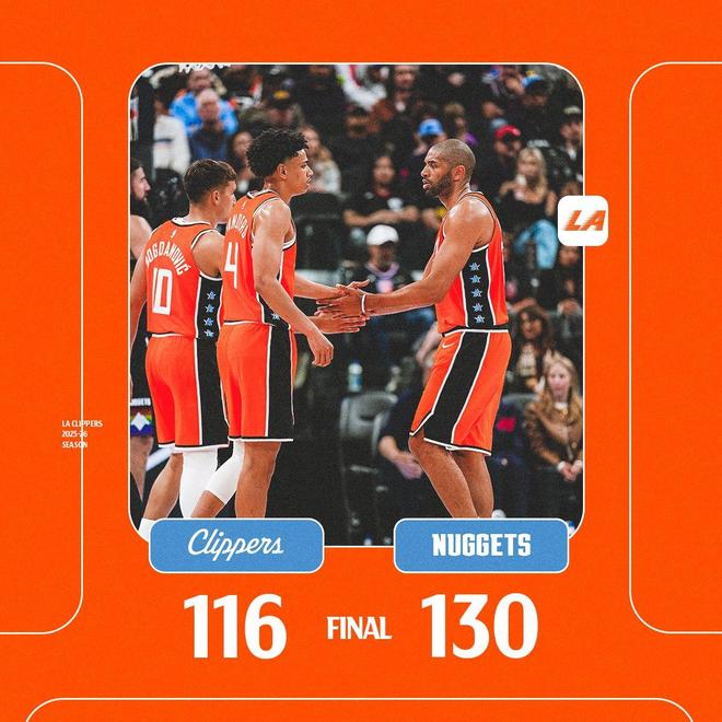 兩隊隨后都換上了板凳席末端的球員,比賽時間逐漸走完。最終,掘金以130比116完勝快船。丹佛實現(xiàn)了6連勝,排名升至西部第二,快船吞下了6連敗,跌至西部倒數(shù)第4。