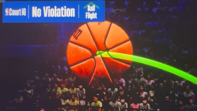 哈登在第一加時(shí)最后1分半鐘投進(jìn)了兩記關(guān)鍵三分,且兩次都是在落后情況,可惜最后一攻被加福德封蓋——此處感嘆下,科技進(jìn)步實(shí)在太大,NBA的回放技術(shù)(Court IQ)居然連球的軌跡都能畫出來,神奇。