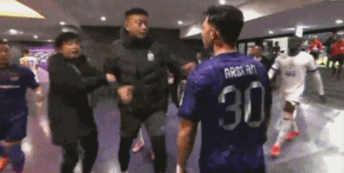 雙方球隊(duì)來(lái)到球員通道,意外的一幕:廣島三箭隊(duì)外援阿爾斯蘭居然在臺(tái)階等候,當(dāng)看到高天意走過(guò)來(lái),直接上去推搡后者,不過(guò)高天意并未與之硬剛。