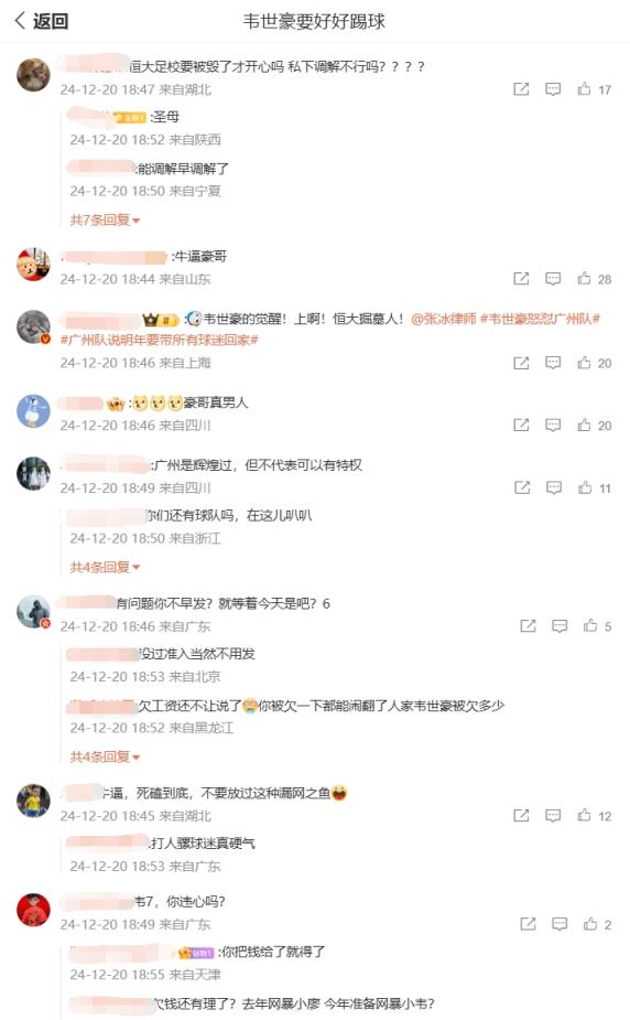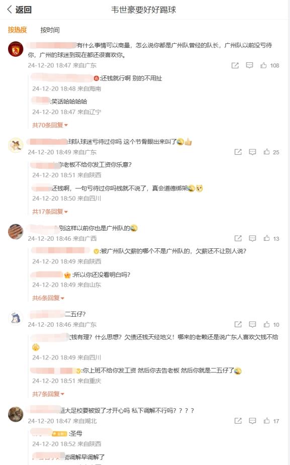 在韋世豪的微博評(píng)論區(qū)下充斥著兩種聲音,一種認(rèn)為韋世豪當(dāng)初也是廣州隊(duì)隊(duì)長(zhǎng),有什么事可以商量,另一種則認(rèn)為俱樂部欠債還錢天經(jīng)地義。你怎么看?