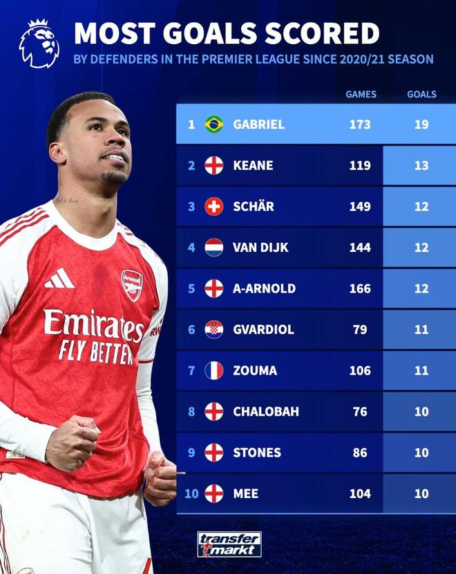 北京時(shí)間12月31日,德轉(zhuǎn)統(tǒng)計(jì)了自2020-21賽季以來英超后衛(wèi)進(jìn)球榜,加布里埃爾以19球高居第一,范戴克、亞歷山大-阿諾德、格瓦迪奧爾、查洛巴以及斯通斯上榜。