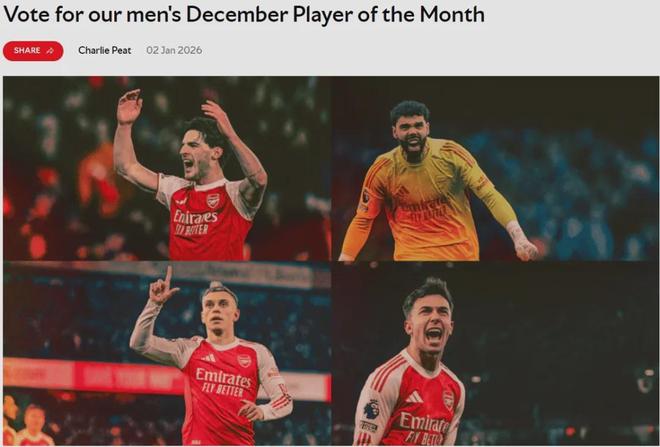 官方:賴斯、拉亞、特羅薩德和祖比門迪被提名為了阿森納12月份隊內(nèi)最佳候選。