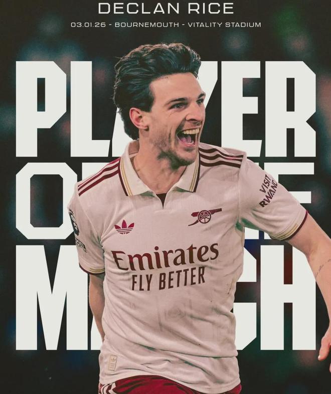 賴斯被英超和阿森納官方評為了本場比賽最佳球員。