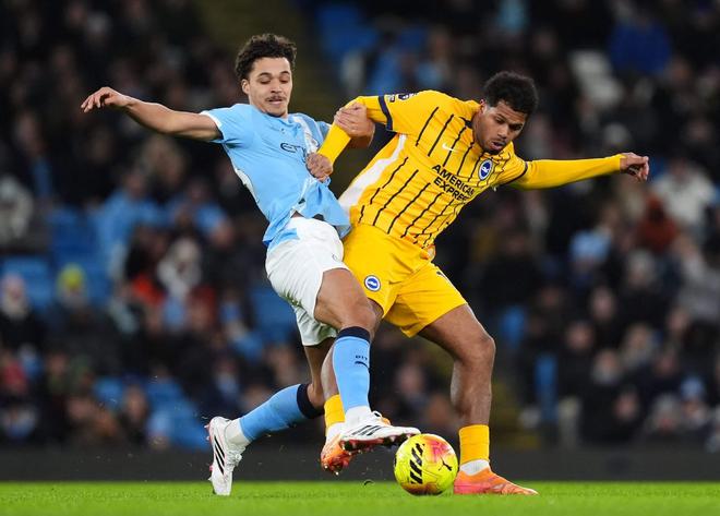 這對(duì)組合本身對(duì)曼城來(lái)說(shuō)并非明顯的問(wèn)題;事實(shí)上,胡桑諾夫看起來(lái)非常穩(wěn)健,能夠利用他的侵略性和回追速度挫敗布萊頓的一些反擊。阿萊恩在開(kāi)場(chǎng)階段似乎對(duì)喬治尼奧-魯特有些吃力,讓客隊(duì)得以圍繞魯特展開(kāi)進(jìn)攻并將球傳入他創(chuàng)造出的空間,但這位20歲的球員隨后穩(wěn)住了陣腳,看起來(lái)非常沉著,尤其是在球的運(yùn)用上。
